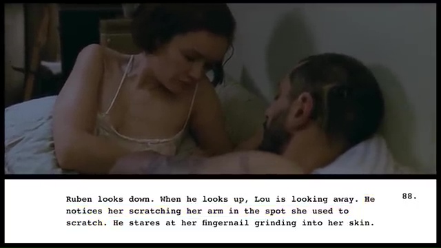 در ادامه، وقتی روبن و لو با هم در تخت هستند، روبن به او میگوید که باید گروه موسیقی را دوباره احیا کنند. وقتی او با تأکید دربارهی احیای گروه موسیقی حرف میزند، متوجه میشود که لو دوباره در حال خاراندن دستش است؛ کاری که قبلاً از راه آن به خود آسیب وارد میکرد. در اینجا عمل خاراندن پر از زیرلایههایی معنایی است.