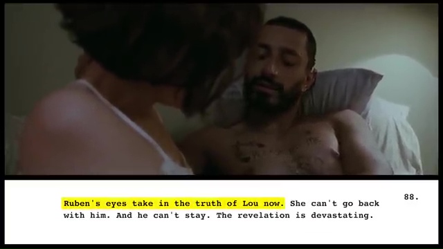 اواخر فیلم، در صفحهی ۸۲ فیلمنامه، روبن و لو دوباره همدیگر را میبینند و روبن متوجه تغییرات مثبت در لو میشود. او متوجه میشود که لو دیگر به بدن خود آسیب وارد نکرده است. آن دو همدیگر را در آغوش میکشند.